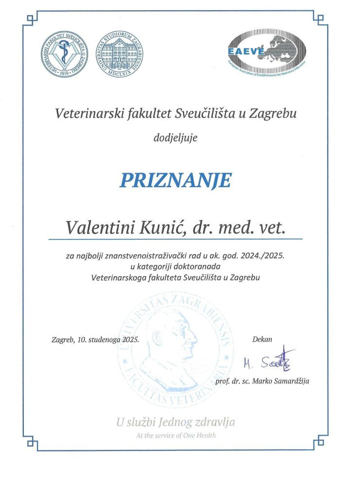 S ponosom objavljujemo da je našoj doktorandici, Valentini Kunić s Hrvatskog veterinarskog instituta, dodijeljeno priznanje za najbolji znanstvenoistraživački rad u akademskoj godini 2024./2025. u kategoriji doktoranada Veterinarskog fakulteta Sveučilišta u Zagrebu.