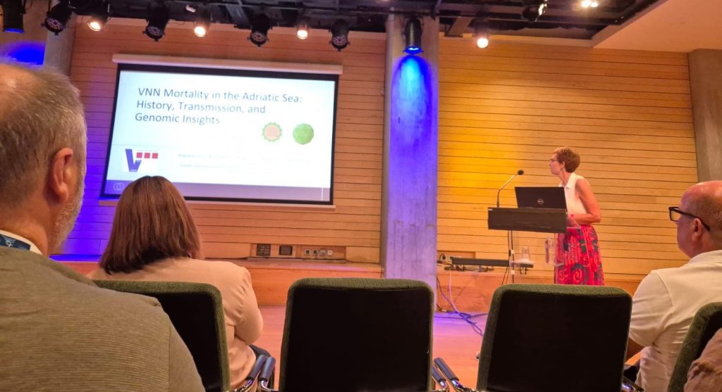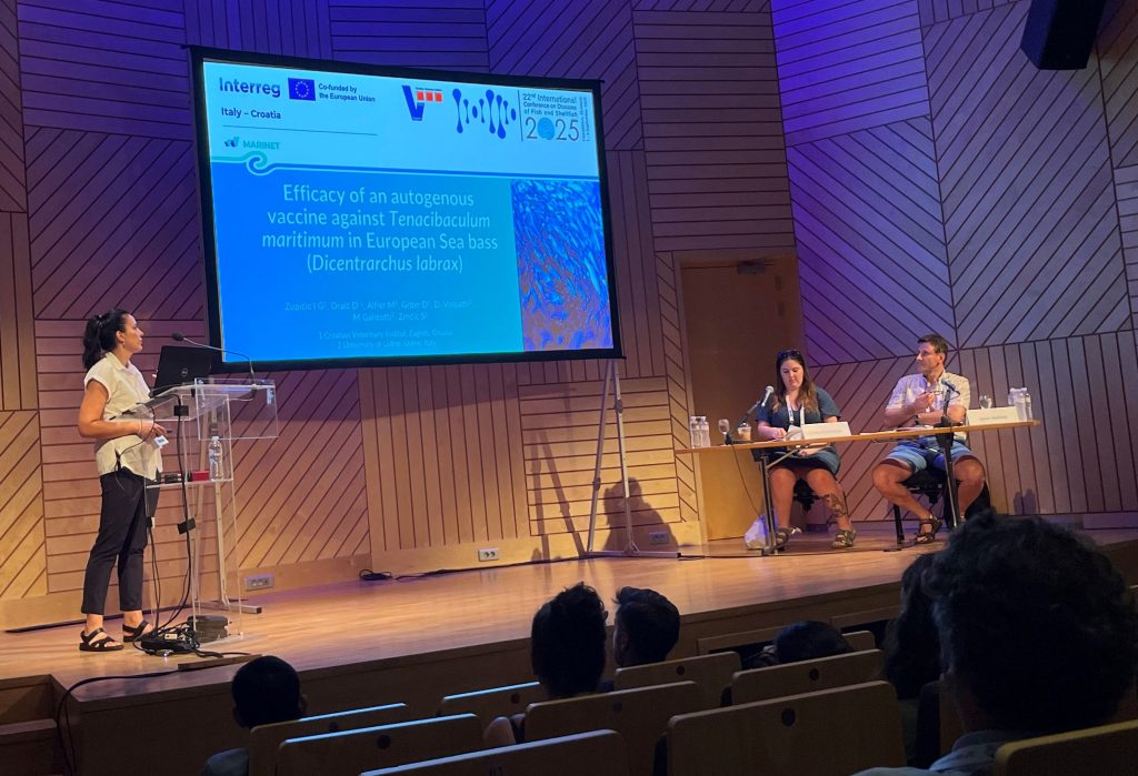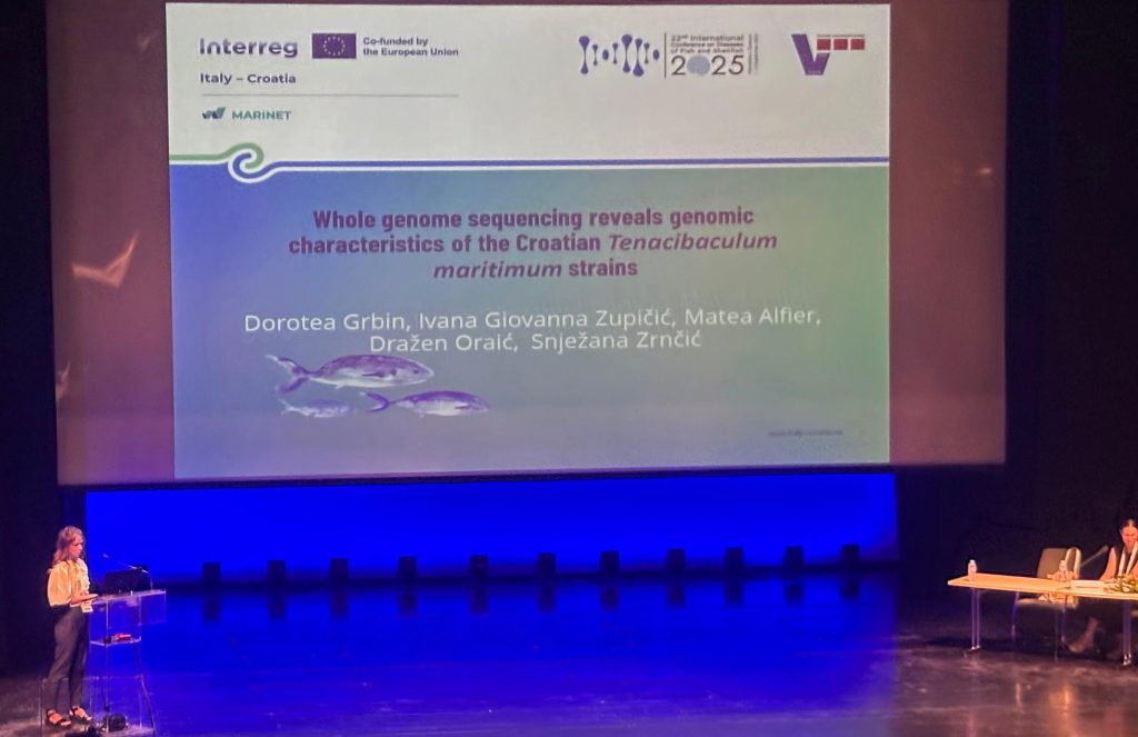 Dr. sc. Dorotea Grbin i dr. sc. Ivana Giovanna Zupičić prikazale su rezultate istraživanja provedenih u okviru Interreg Italija–Hrvatska projekta MARINET. Dr. sc. Dorotea Grbin izložila je rad „Whole Genome Sequencing Reveals Genomic Characteristics of the Croatian Tenacibaculum maritimum Strains“, dok je dr. sc. Ivana Giovanna Zupičić predstavila „Efficacy of an autogenous vaccine against Tenacibaculum maritimum in European seabass (Dicentrarchus labrax)“.